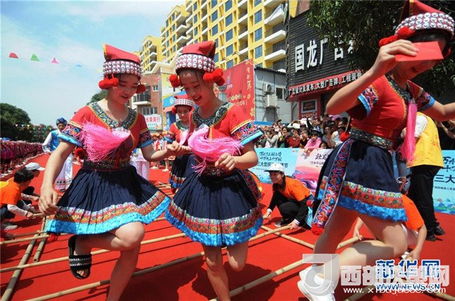 4月18日,在廣西上思縣舉行的“三月三”民俗風情節(jié)上,少數(shù)民族同胞在跳竹竿舞。新華社發(fā)(梁富盈 攝)