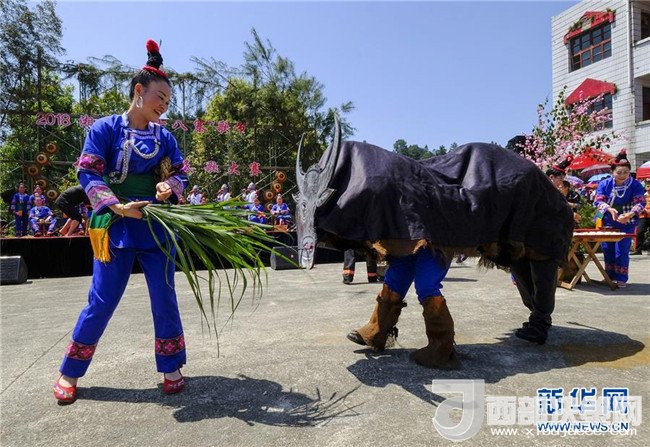 4月18日,在貴州省天柱縣坌處鎮(zhèn),人們表演農(nóng)耕場景慶祝“三月三”。新華社發(fā)(龍勝洲 攝)