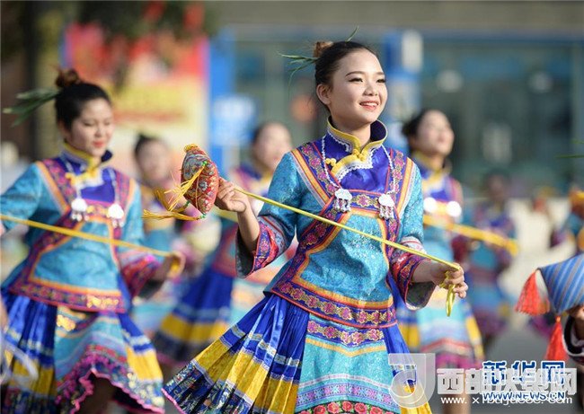4月18日,布依族同胞在貴州省望謨縣王母廣場跳布依糠包舞慶祝“三月三”。新華社發(fā)(鄧剛 攝)