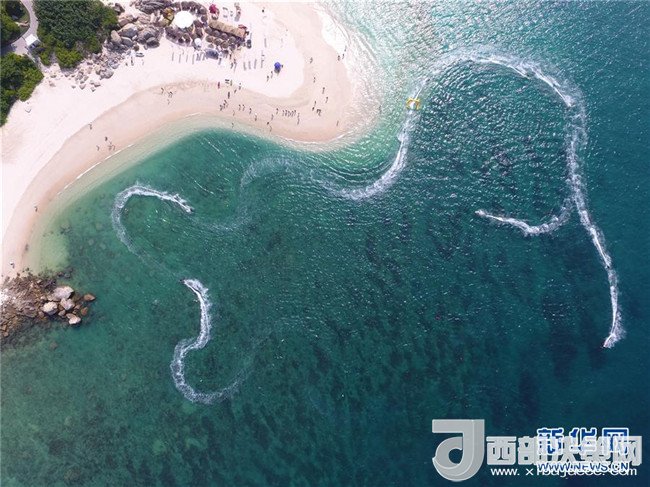 在三亞蜈支洲島參加2016動力沖浪板國際賽中國站的選手在比賽中(2016年9月18日無人機拍攝)。新華社記者 楊冠宇 攝