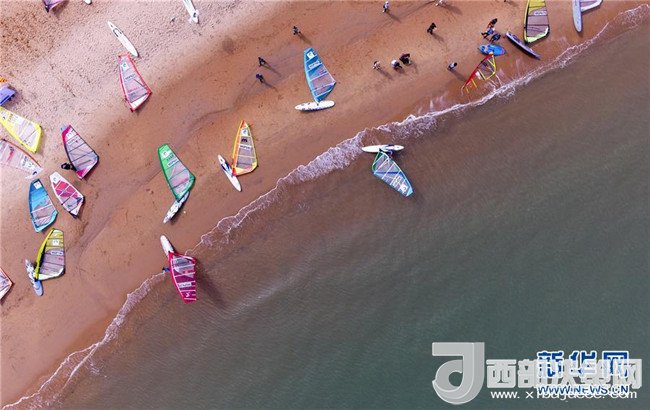 參加2017第四屆國際旅游島帆板大獎賽??诖螵勝惖倪x手在比賽結束后上岸(2017年11月16日無人機拍攝)。新華社記者 楊冠宇 攝