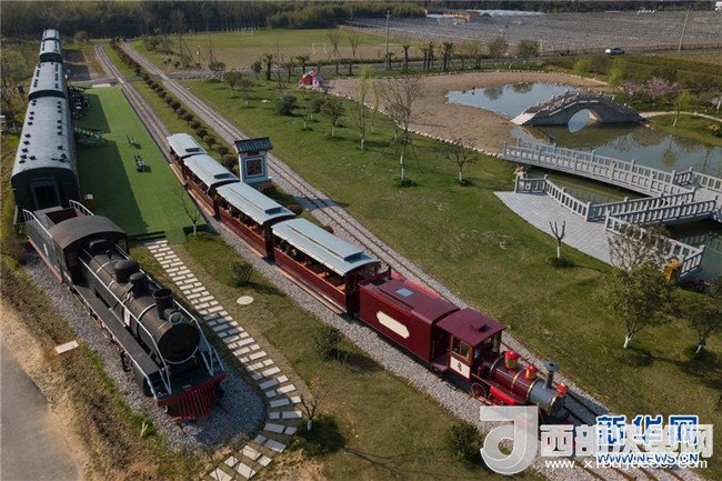游客乘坐觀光小火車從浙江省安吉縣魯家村的休閑驛站邊駛過(guò)(3月23日無(wú)人機(jī)拍攝)。