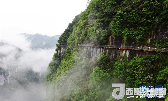 5月1日,游客在湖南省吉首市的懸崖棧道上游覽。當(dāng)日,吉首市雨過(guò)天晴,山區(qū)云霧縹緲,變幻多姿。新華社發(fā) 姚方 攝