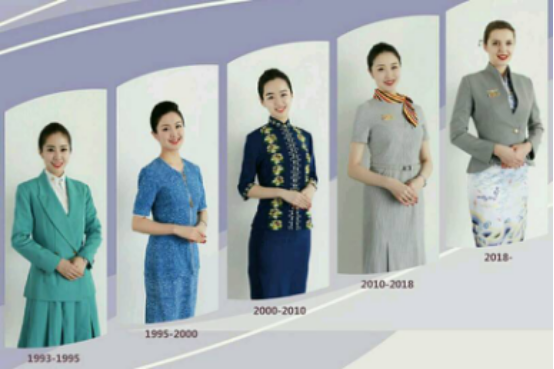 歲月變遷,以?xún)?yōu)質(zhì)服務(wù)贏得客戶(hù)青睞的初心不改。圖為海航空乘人員的五代服裝,反應(yīng)了時(shí)代的變化。