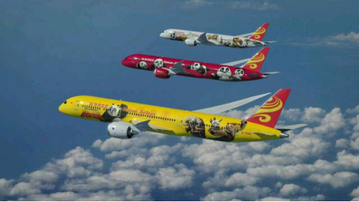 海南航空與夢(mèng)工廠合作推出的三架“功夫熊貓”涂裝飛機(jī)翱翔藍(lán)天