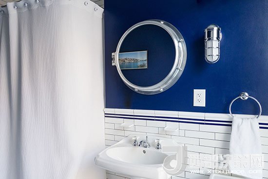 衛(wèi)浴間選擇深藍(lán)色與白色搭配,墻面中間位置用藍(lán)色條紋腰線來裝飾,頗有海軍風(fēng)的味道,干凈清爽。