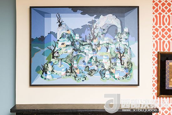 壁爐上方的墻面用掛畫來裝飾,藍(lán)色系的色彩與家居整體風(fēng)格相融合,富有創(chuàng)意感的畫面讓家更有藝術(shù)氣息。