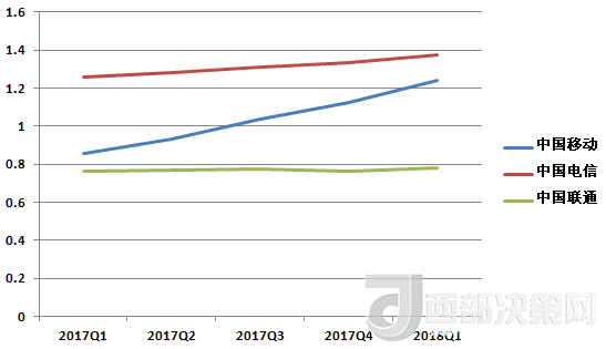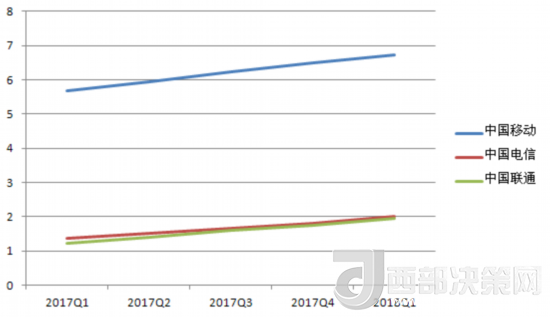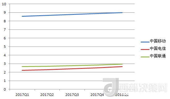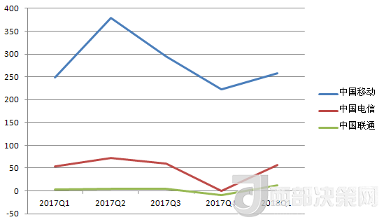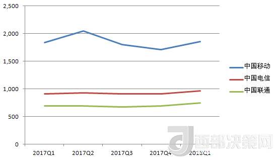 中國電信的營收除了在2017年Q3有所下降,基本處于穩(wěn)步增長趨勢。其2018年Q1的營收數(shù)據(jù)也在三大運(yùn)營商中排中間。