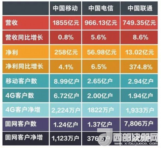 三大運(yùn)營商在各方面皆呈增長態(tài)勢。移動(dòng)的營收、凈利雖高,但其營收同比增長率僅為0.8%。聯(lián)通的凈利潤同比增長率高達(dá)374.8%,營收同比增幅也是最高,混改成效顯著。