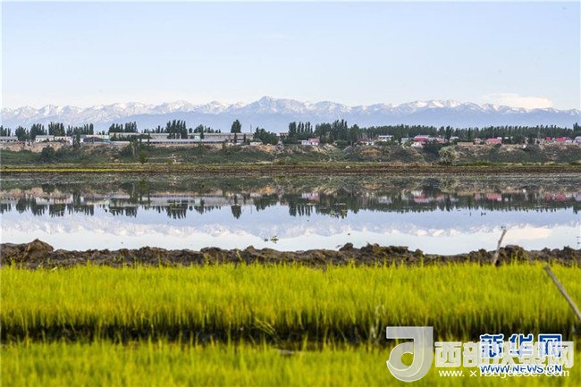 在新疆察布查爾錫伯自治縣種羊場(chǎng)托海依村拍攝的一處農(nóng)田,秧苗與遠(yuǎn)處的雪山相映成趣(5月21日攝)。近日,隨著氣溫漸高,地處新疆伊犁河谷的察布查爾錫伯自治縣迎來(lái)插秧高峰期,田間地頭一派繁忙景象。塊塊稻田水滿如鏡,田間防護(hù)林枝繁葉茂,遠(yuǎn)處雪山依稀可見(jiàn),如一幅在大地上鋪展開(kāi)的生態(tài)畫(huà)卷。新華社記者胡虎虎攝