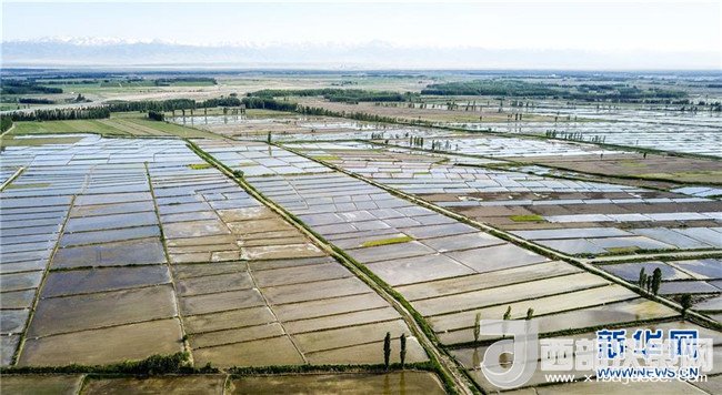 在新疆察布查爾錫伯自治縣扎庫(kù)齊牛錄鄉(xiāng)拍攝的一處水稻田(5月21日無(wú)人機(jī)拍攝)。近日,隨著氣溫漸高,地處新疆伊犁河谷的察布查爾錫伯自治縣迎來(lái)插秧高峰期,田間地頭一派繁忙景象。塊塊稻田水滿如鏡,田間防護(hù)林枝繁葉茂,遠(yuǎn)處雪山依稀可見(jiàn),如一幅在大地上鋪展開(kāi)的生態(tài)畫(huà)卷。新華社記者胡虎虎攝