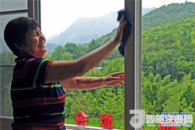 6月2日,安吉縣余村村民胡領(lǐng)珠在擦拭自家民宿客房的窗框。今年66歲的胡領(lǐng)珠和家人于2017年5月將自家農(nóng)房改造成民宿,1年多來接待游客1萬多人次。新華社記者 譚進 攝