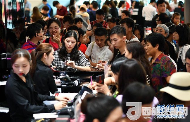 顧客在海南三亞海棠灣免稅店內(nèi)的一家化妝品店排隊付款(2月18日攝)。