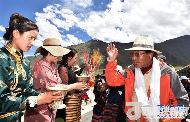 6月18日,嘎沖村群眾(左)向來自遠(yuǎn)方的新鄰居敬獻(xiàn)青稞酒。