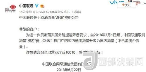 繼中國移動之后,中國聯(lián)通也于同日通過官方微博宣布:自2018年7月1日起,中國聯(lián)通取消流量“漫游”費,新老手機用戶的省內通用流量升級為國內流量(不含港澳臺流量)。