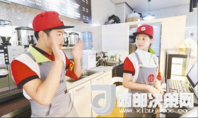 6月21日,在貴陽市貴陽北站一家名為“無聲飲品”的飲料店內(nèi),服務(wù)員在用手語相互交流。從點(diǎn)單到付款,再到制作交遞,店員和顧客間都通過手語或手寫紙條進(jìn)行交流。這家小店是貴陽市盲聾啞學(xué)校的校企合作項(xiàng)目,店內(nèi)所有服務(wù)人員均是聾啞學(xué)生。截至目前,貴陽已有4家“無聲飲品”店,為近50名聾啞學(xué)生提供了實(shí)習(xí)和就業(yè)平臺。歐東衢攝