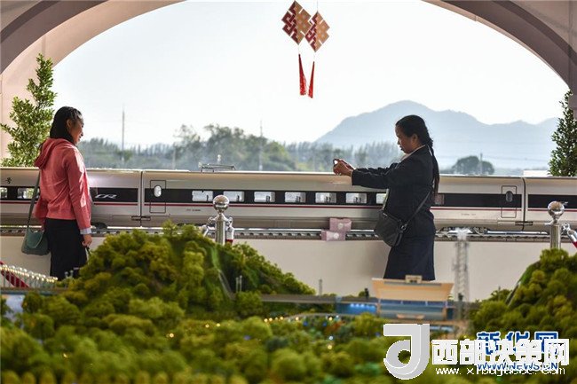 在泰國東北部呵叻府巴沖縣,參觀者在中泰鐵路合作項目一期工程開工儀式上與展出的中國復(fù)興號高鐵列車模型合影(2017年12月21日攝)。新華社記者 李芒茫 攝