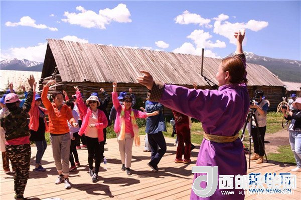 游客在喀納斯景區(qū)向當地少數民族學習舞蹈(6月24日攝)。