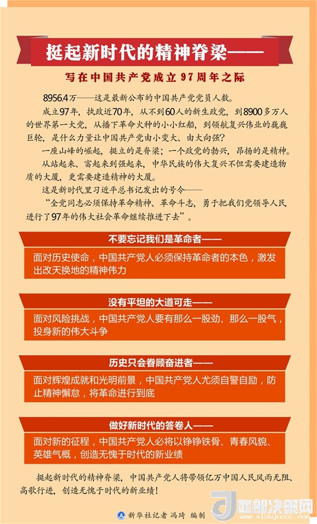 挺起新時代的精神脊梁,中國共產(chǎn)黨人將帶領(lǐng)億萬中國人民風(fēng)雨無阻、高歌行進,創(chuàng)造無愧于時代的新業(yè)績?。ㄓ浾撸黑w承、詹勇、張曉松、謝良、周文林、陳煒偉、朱基釵、吳晶、姜瀟、王卓倫、榮啟涵)