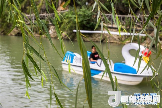 7月11日,在貴州省大方縣黃泥塘鎮(zhèn)烏溪生態(tài)農(nóng)業(yè)避暑園,游人坐船游玩。