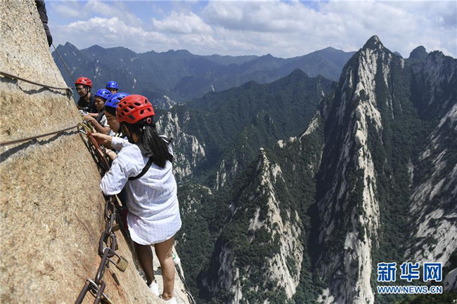 被譽為“華山第一天險”的長空棧道,位于陜西省華陰市五岳華山南峰東側(cè)山腰,在萬仞絕壁上鑲嵌石釘搭木椽而筑。 由于長空棧道貼崖懸空,對探險獵奇者極具誘惑性和挑戰(zhàn)性,吸引歷險探勝者絡(luò)繹不絕。新華社記者 陶明 攝
