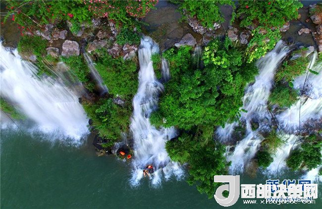 7月18日,市民在廣西柳州市蟠龍山瀑布群下戲水消暑(無人機拍攝)。