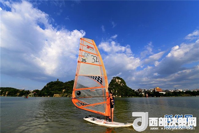 7月18日,在廣西柳州市金沙角水域,一名帆板愛好者在江面上練習(xí)帆板。