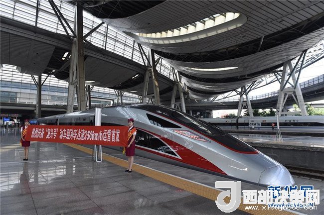 在北京南站拍攝的G13次“復(fù)興號”列車(2017年9月21日攝)。350公里時速的正式運(yùn)營,標(biāo)志著我國成為世界高鐵商業(yè)運(yùn)營速度最高的國家。新華社記者羅曉光攝