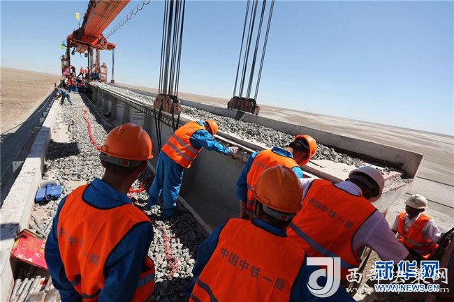 8月17日,在新疆若羌縣,施工人員對(duì)合龍后的臺(tái)特瑪湖特大橋進(jìn)行最后檢查,確保梁體精準(zhǔn)對(duì)位。8月17日11時(shí)58分,在一組架橋機(jī)和運(yùn)梁機(jī)的協(xié)調(diào)配合下,隨著最后一孔T型梁上的梁體精準(zhǔn)吊裝到位,全長(zhǎng)24.558公里、歷時(shí)2年建設(shè)的格庫(kù)鐵路(青海格爾木——新疆庫(kù)爾勒)最長(zhǎng)鐵路橋——新疆臺(tái)特瑪湖特大橋?qū)崿F(xiàn)合龍。新華社發(fā)
