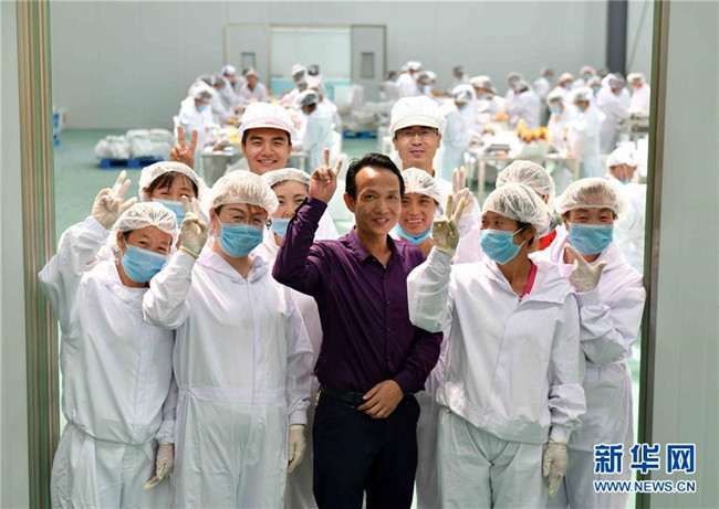 黃玉仁(前排中)在寧夏固原市隆德縣寧夏黃土地農(nóng)業(yè)食品有限公司與當?shù)貑T工合影(8月29日攝)。來自福建莆田的黃玉仁2017年在隆德縣創(chuàng)辦寧夏黃土地農(nóng)業(yè)食品有限公司,利用當?shù)伛R鈴薯種植優(yōu)勢,制作馬鈴薯深加工產(chǎn)品,促進當?shù)伛R鈴薯銷售和農(nóng)民增收。目前公司已建成4條生產(chǎn)線,為當?shù)?0多名百姓解決就業(yè)。 新華社記者郭緒雷攝