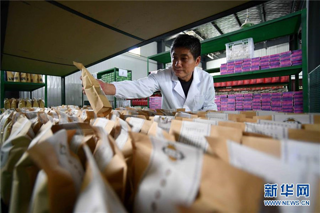 林玉清在寧夏固原市西吉縣寧夏澤艾堂生物科技有限公司查看艾草產(chǎn)品(8月30日攝)。來自福建莆田的林玉清2017年3月在西吉縣成立寧夏澤艾堂生物科技有限公司,依托西吉縣優(yōu)質(zhì)的艾草種植條件,采用“公司+合作社+農(nóng)戶”的訂單農(nóng)業(yè)合作模式,與吉強、新營等鄉(xiāng)鎮(zhèn)種植專業(yè)合作社合作建成艾草種植基地11個、推廣種植艾草6000畝,為當?shù)厝罕娒撠氈赂讳伨托侣纷?。新華社記者郭緒雷攝