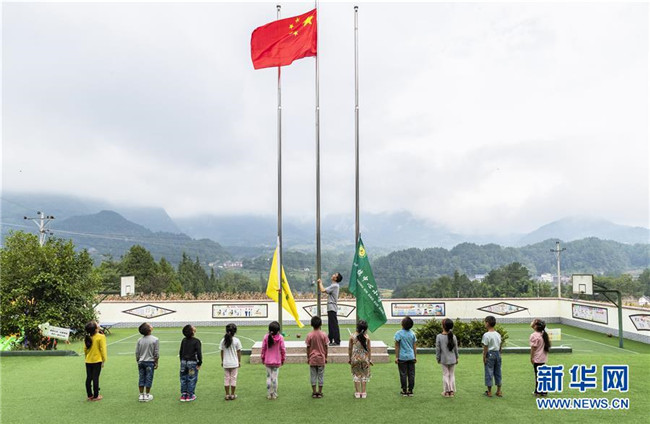 9月6日,在重慶市南川區(qū)大有鎮(zhèn)水源村僑心小學,教師江開華和孩子們一起參加升旗儀式。