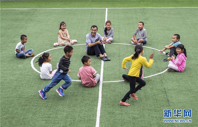 9月6日,在重慶市南川區(qū)大有鎮(zhèn)水源村僑心小學,教師江開華和孩子們一起玩游戲。新華社發(fā)(瞿明斌攝)