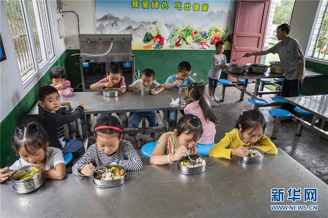 9月6日,在重慶市南川區(qū)大有鎮(zhèn)水源村僑心小學,教師江開華照顧孩子們吃午飯。新華社發(fā)(瞿明斌攝)