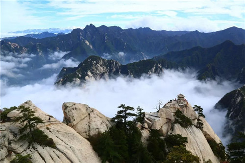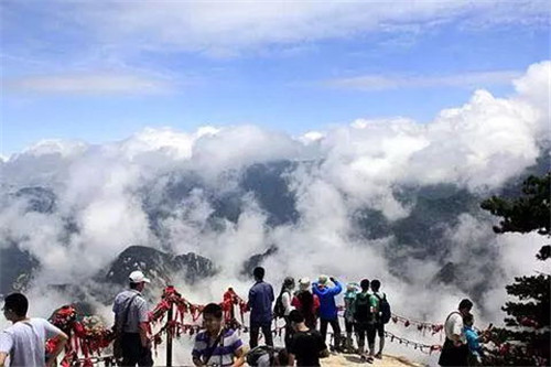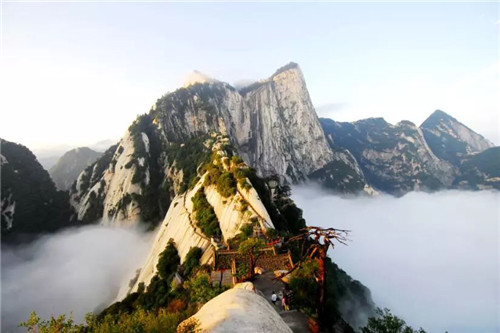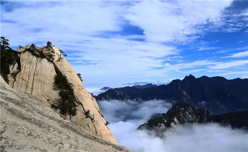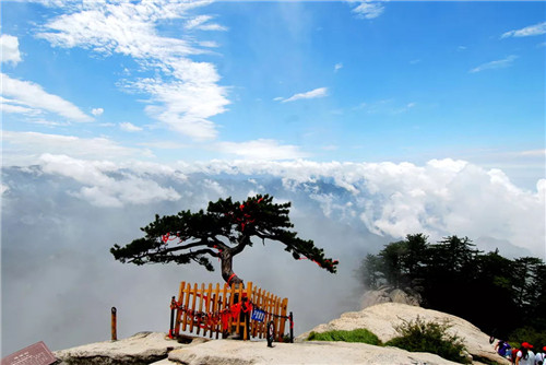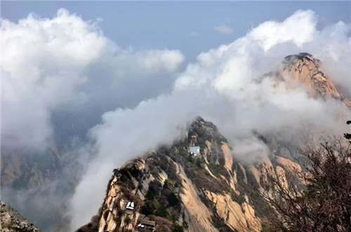 漫步于華山的峰嶺山道,到處可以看到許多與云有關(guān)的景點(diǎn),也能從與云有關(guān)的神奇?zhèn)髡f中,感受到宛若仙境的景象。五云峰是華山諸峰中最富有詩(shī)情畫意的一座峰嶺。每逢深秋季節(jié),松翠楓赤,山花耀目,在太陽光的照射下,猶如五色彩云,霓裳般妝扮了山的容顏。在這里,松楓山花都成了五彩云霧。而位于云臺(tái)峰以北的白云峰,山峰的若石就如白云一樣漂浮在空中。傳說漢元帝劉爽的女兒南陽公主為避離亂之苦,遠(yuǎn)離塵露,就到白云峰隱居修行,修煉功成,駕鶴乘云而去。