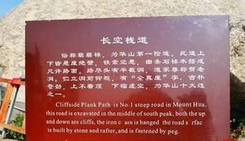 在約2160米高的峭壁上鑿出踏腳之處,鑲嵌石釘搭木椽并用鐵索固定建造的一條懸空棧道,那就是長空棧道。它位于華山極頂南峰東側南天門外的山腰間,經(jīng)燕子叼表、朝元洞,踩崖隙凌空懸梯下10余華山長空棧道米,沿附懸崖而搭寬不盈尺的方木棧道至全真巖下。