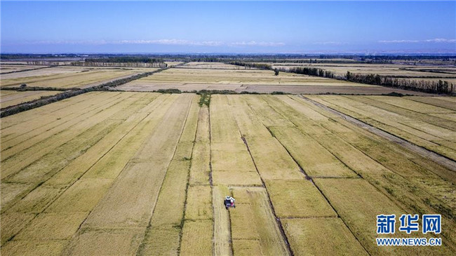 收割機(jī)在地處新疆察布查爾錫伯自治縣種羊場(chǎng)的“萬畝水稻優(yōu)質(zhì)高產(chǎn)高效示范區(qū)”收割水稻(9月26日無人機(jī)拍攝)。眼下,地處新疆伊犁河谷的察布查爾錫伯自治縣約20萬畝水稻迎來收割季。當(dāng)?shù)剞r(nóng)民搶抓農(nóng)時(shí),忙碌在金色田園中。記者 胡虎虎 攝