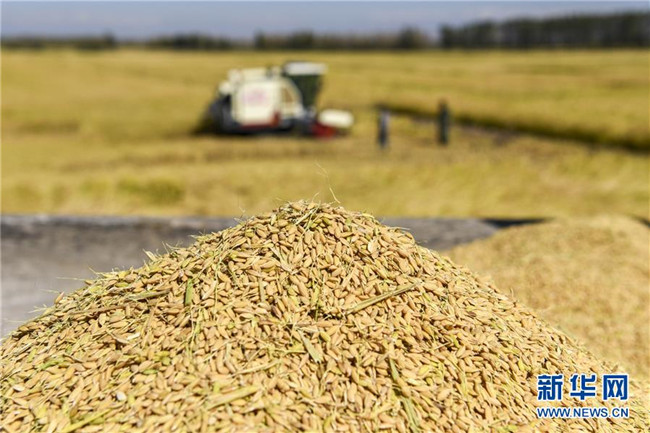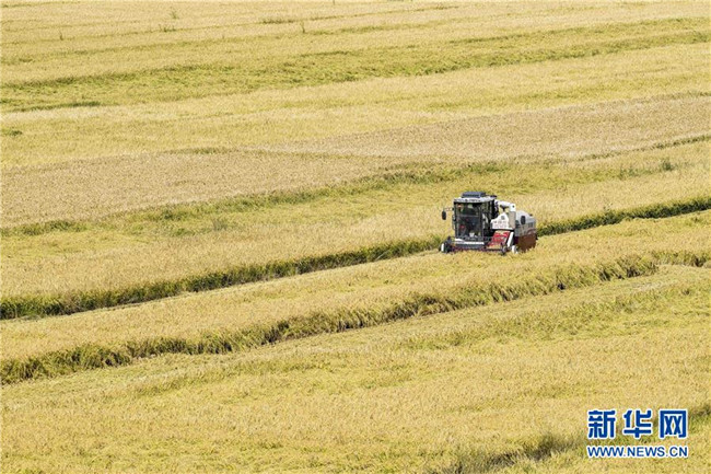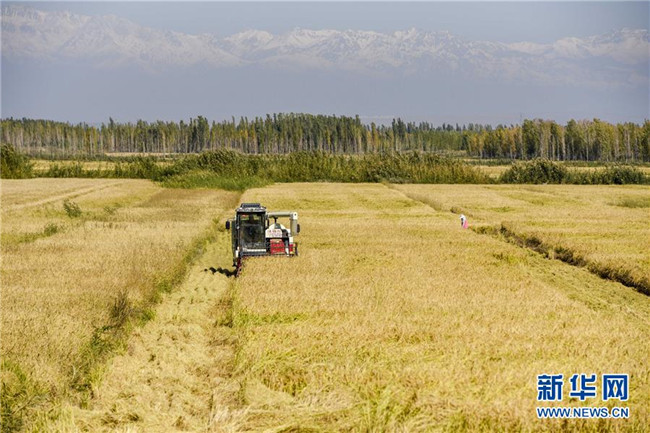 9月26日,收割機(jī)在新疆察布查爾錫伯自治縣納達(dá)齊牛錄鄉(xiāng)的一處稻田收割水稻。眼下,地處新疆伊犁河谷的察布查爾錫伯自治縣約20萬畝水稻迎來收割季。當(dāng)?shù)剞r(nóng)民搶抓農(nóng)時(shí),忙碌在金色田園中。記者 胡虎虎 攝