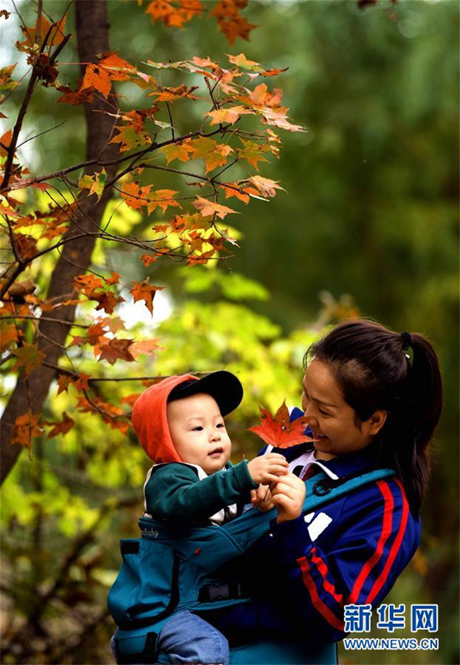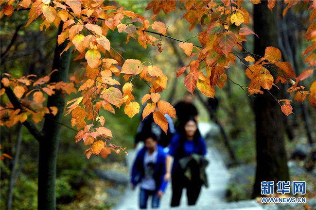 10月6日,游客在位于太行山東麓的靈壽縣五岳寨自然風景區(qū)內(nèi)觀賞紅葉。新華社發(fā)(陳其保 攝)