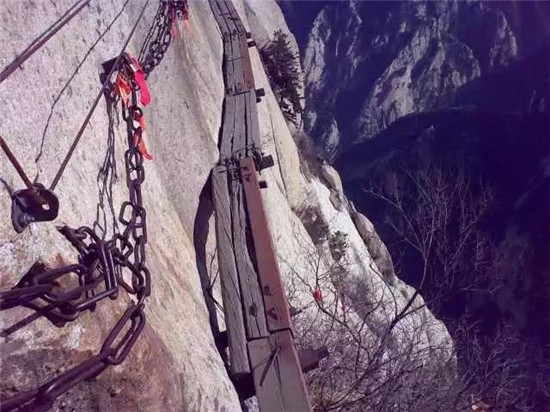 金鎖關(guān):到達(dá)金鎖關(guān)時(shí),眼前大片大片的紅色,游人的視覺(jué)和心靈受到強(qiáng)烈的沖擊。這是沿路兩邊鐵鏈上綁滿的密密麻麻的紅色絲繩,不留一絲空隙,風(fēng)吹來(lái),長(zhǎng)長(zhǎng)的紅色絲繩就輕盈的舞起來(lái),如愛(ài)情牢固的臂膀,甜蜜的飛翔在華山之上。讓一把感情鎖和華山一同到地老天荒,成為一個(gè)“山無(wú)陵,天地絕,乃敢與君絕”的千古情愛(ài)神話。