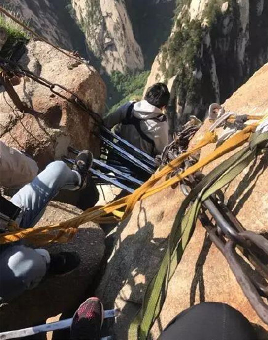 鷂子翻身:這條據(jù)說(shuō)坡度在120度的懸崖峭壁主要靠臂力,只能用手抓著鐵鏈,腳摸索著探路。人是從上往下攀緣,崖壁往里傾,從上往下望,只有云,只有山峰,什么都不見(jiàn)。這里的可怕在于你不知腳下的路,更無(wú)法預(yù)知危險(xiǎn),一不留神就會(huì)兩腳懸空,被保險(xiǎn)繩吊在空中。