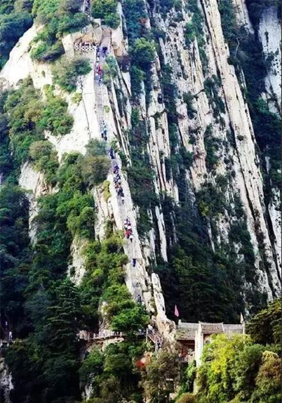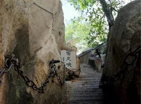 千尺幢:一條陡峭的鳥道從懸崖穿過(guò),僅能容兩人上下,坡度成一條垂直的線,372個(gè)臺(tái)階向天而上,就像一頭瘦骨嶙峋的老牛的肋骨,承載了數(shù)不清游人沉重的腳步。弓著身子努力向上攀爬的時(shí)候,雙手使勁拉住了旁邊的鐵鏈,嘩啦嘩啦的聲音始終在千尺幢這里回響著,除去鐵鏈的聲響,這條鳥道充滿的是小心翼翼的安靜,偶爾有人喊一聲,也是脫口而出的叮嚀和提醒。