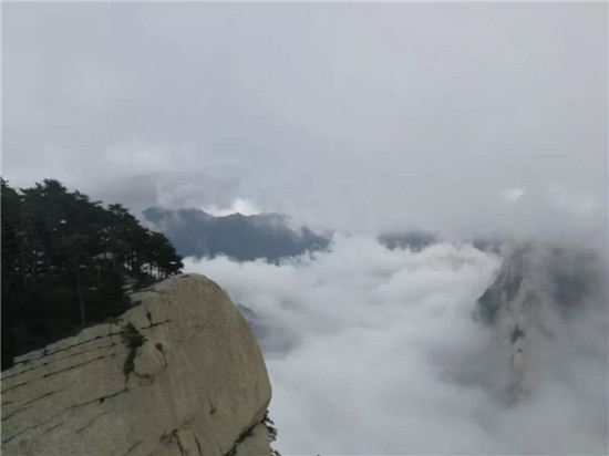 秋季,云海經常出現在雨后,融入華山云海,騰云駕霧,風拂衣抖,有種飛一樣的感覺。眼前陡壁峭崖蹤影全無,高聳的山峰如飄渺的仙島。華山已無險可防可守,任憑滾滾云海,洶涌澎湃的肆虐。云依著霧,霧掛著云,依偎纏綿,飛升莫測,風生變幻。一會兒如獅虎,如鷹鷂,一會兒似神兵,似仙女,蒸騰極富想象力。華山峰巒似懸島明滅,若隱若現。如果夠幸運還會看到彩虹哦!