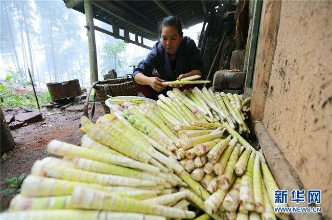 10月14日,在貴州赤水市寶源鄉(xiāng)聯(lián)華村,竹農(nóng)為鮮筍去殼。金秋時(shí)節(jié),貴州省赤水市寶源、兩河口、丙安等鄉(xiāng)鎮(zhèn)種植的5萬余畝大竹筍迎來收獲季。當(dāng)?shù)刂褶r(nóng)加緊采挖竹筍,進(jìn)行加工后外銷。素有“中國竹子之鄉(xiāng)”的赤水市,現(xiàn)有竹林面積132.8萬畝。竹產(chǎn)業(yè)已經(jīng)成為當(dāng)?shù)孛撠氃鍪盏闹饕乐弧#ㄍ蹰L育 攝)