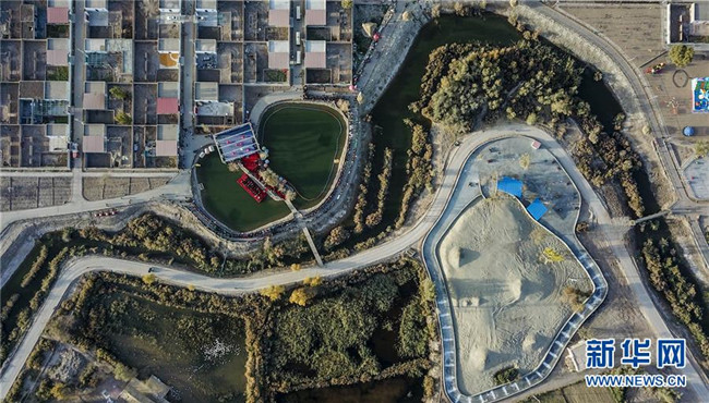 新疆巴楚縣阿納庫勒鄉(xiāng)果勒買里村濱河體育文化公園(10月22日無人機拍攝)。 新疆巴楚縣阿納庫勒鄉(xiāng)果勒買里村緊鄰巴楚縣城,區(qū)位優(yōu)勢明顯。近年來,新疆維吾爾自治區(qū)體育局“訪民情”“惠民生”“聚民心”駐村工作隊幫助村里完善基礎設施和改善村容村貌,借助節(jié)慶活動大力發(fā)展鄉(xiāng)村旅游,吸引周邊及外地游客前來觀光休閑,既豐富了村民的文化生活,又為村民增收致富拓寬了門路。 新華社記者 胡虎虎 攝
