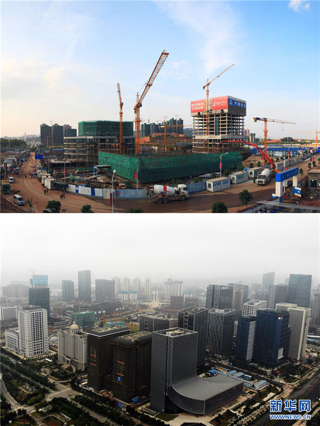 拼版照片。上圖為建設(shè)中的五象新區(qū)總部基地(2014年7月8日,譚毅 攝);下圖為無人機(jī)航拍的五象新區(qū)總部基地(2018年10月22日,新華網(wǎng) 章佳禮 攝)