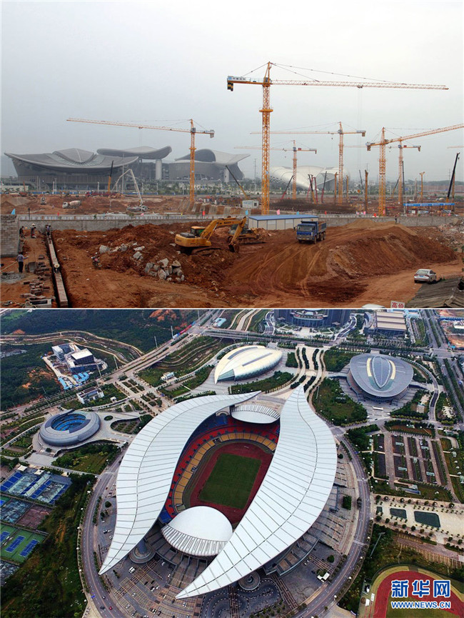 拼版照片。上圖為施工中的廣西體育中心三期工程(2013年4月27日攝);下圖為無人機(jī)航拍的廣西體育中心比賽場館(2018年10月22日,新華網(wǎng) 章佳禮 攝)