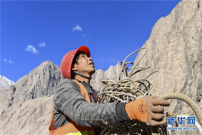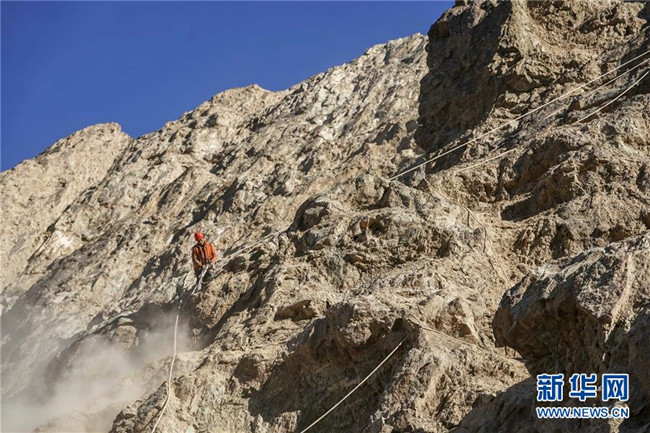 11月12日,在新疆塔什庫爾干塔吉克自治縣大同鄉(xiāng)鄉(xiāng)政府附近的一處路段,工人背著施工設(shè)備在峭壁上攀爬。 近日,一支由四川、云南等地工人組成的施工隊(duì)忙碌在帕米爾高原深處的大山中,為塔什庫爾干塔吉克自治縣縣城至大同鄉(xiāng)道路的易落石路段安裝防護(hù)網(wǎng)。崇山峻嶺間,工人要攀爬至峭壁上施工作業(yè),如躍動(dòng)在大山間的“舞者”。據(jù)介紹,這支施工隊(duì)常年活躍在新疆山區(qū)道路的施工現(xiàn)場(chǎng),為風(fēng)險(xiǎn)路段加裝安全防護(hù)裝置,保障過往車輛和沿途村民出行安全。 新華社記者 胡虎虎 攝