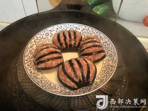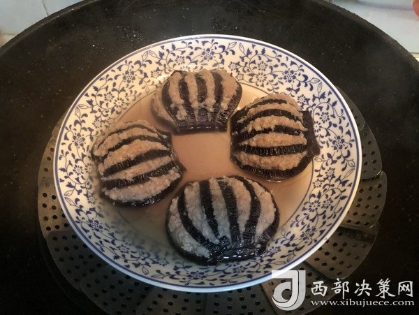 5鍋中煮沸水,放入裝茄子的盤(pán)子,蓋上鍋蓋大火蒸15分鐘