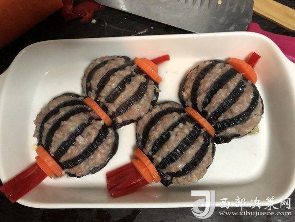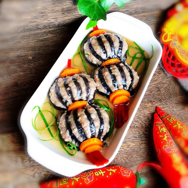 “今天買(mǎi)了一個(gè)大茄子,釀入豬肉餡,樣子像極了燈籠,如果你想顏色更深一點(diǎn),那就在調(diào)肉餡的時(shí)候加點(diǎn)老抽甚至加點(diǎn)紅曲粉,最后調(diào)澆汁的時(shí)候可以調(diào)成酸甜的番茄汁味,那就看起來(lái)更加的紅紅火火了。不過(guò)我還是比較喜歡這種小清新的風(fēng)格。這道菜一上桌,能把大魚(yú)大肉都比下去,好看好吃還喜慶。”